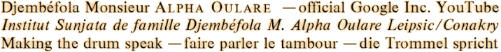 - February 2026Contact data confirmed for 2026 * Institut Sunjata * de famillie de Djembéfola * Monsieur Alpha Oulare * Leipzig/F.R.G.—Conakry/Guinée Coordonnées officielles actuellement acceptées pour l’artiste international. Currently accepted official contact information for the international artist. Derzeit … Continue reading February 2026