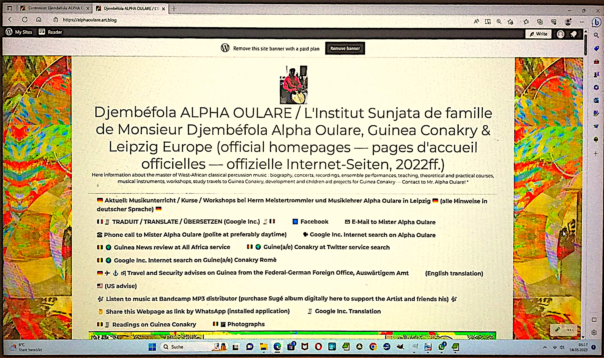 Im Herbst 2023 oder Frühjahr 2024 zu einer musikalischen Reise nach Guinea-Conakry und auf die Isle of Roume mit mehrwöchigen Kursen und anderen Festivitäten? Nicht zum ersten Male bieten Djembéfola Alpha Oulare und seine guineischen ebenso erfahrenen wie freundlichen Mitstreiterinnen und Mitstreiter diese Studien- und Kulturreise an, bitte vertrauen Sie ihnen und beachten Sie auch externe Hinweise zu Reisen nach und zur inneren Sicherheit in Guinea/ Conakry wie hier buchstäblich ausgewiesen: