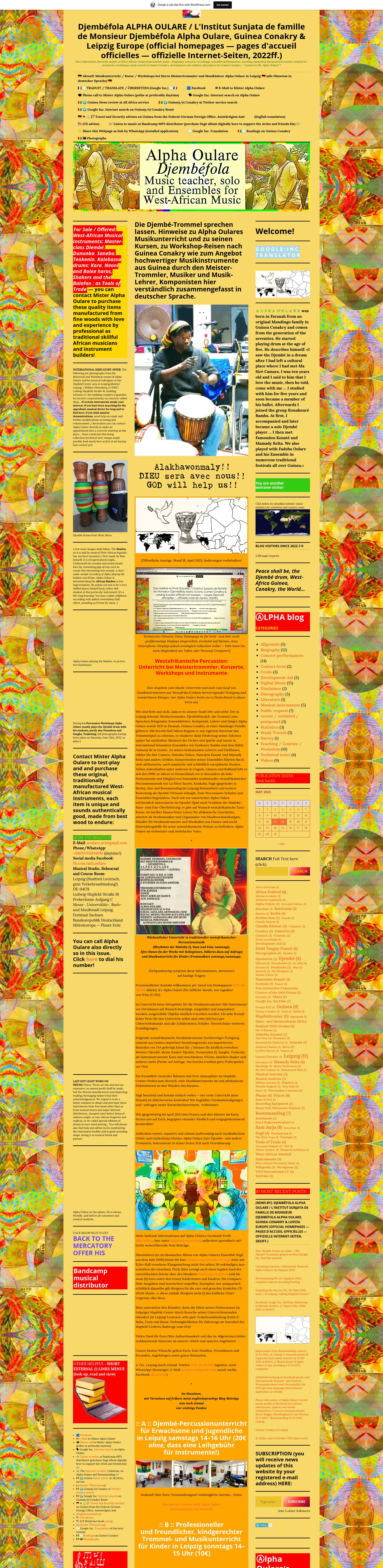 Wir sind froh und stolz, dass er in unserer Stadt lebt und wirkt: Der in Leipzig lebende Meistertrommler, Djembéfola (d.h. die Trommel zum Sprechen Bringende), Ensembleleiter, Komponist, Lehrer und Sänger Alpha Oulare wurde 1970 in Faranah, Guinea Conakry, in einer Mandingo-Familie geboren. Mit bereits fünf Jahren begann er aus eigenem Interesse das Trommelspiel zu erlernen, er studierte dank Förderung seines Talentes später bei namhaften Meistern des Faches und spielte und tanzte in international bekannten Ensembles wie Konkoure Bamba und dem Ballet National de la Guinée. Zu seinen bedeutenden Lehrern und Einflüssen zählen Ma Siré Camara, Fadouba Oulare, Famodou Konaté und Mamady Keïta und andere Größen. Konzertreisen seiner Ensembles führten ihn in viele afrikanische, auch asiatische und schließlich europäische Staaten. Neben Aufenthalten unter anderem in Ungarn, Litauen und Rußland lebt er seit den 1990-er Jahren in Deutschland, wo er besonders als Solo-Perkussionist und Mitglied von Ensembles traditioneller westafrikanischer Percussionsmusik wie La Fôret Sacrée, Konkoba, Sugé (gegründet in Berlin), Aïas und Rootsmanding (in Leipzig) Bekanntheit und weitere Bedeutung als Djembé-Virtuose erlangte, freie Percussions-Schulen und Ensembles begründete. Nach wie vor unterrichtet Alpha Oulare wöchentlich Interessierte im Djembé-Spiel nach Tradition der Malinké-, Suso- und Fula-Überlieferung; er gibt auf Wunsch westafrikanische Tanz-Kurse, ist darüber hinaus freier Lehrer für afrikanische Geschichte, arbeitet als Studiomusiker und Organisator von Musikveranstaltungen, Händler für Musikinstrumente und Musikalien aus Guinea und sucht Entwicklungshilfe für seine westafrikanische Heimat zu befördern. Alpha Oulare ist verheiratet und mehrfacher Vater.